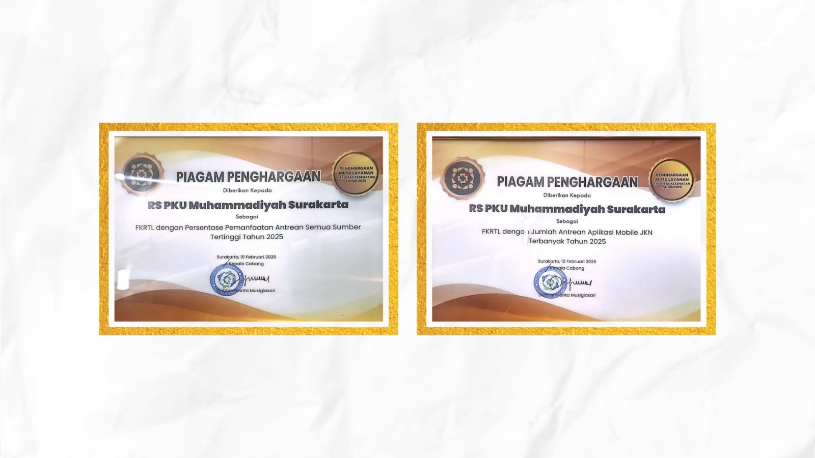 SURAKARTA — RS PKU Muhammadiyah Surakarta kembali meraih prestasi dengan memperoleh dua penghargaan dari BPJS Kesehatan Cabang Surakarta dalam Pertemuan Penguatan Komitmen Mutu Layanan dan Kerja Sama FKRTL Tahun 2026 yang diselenggarakan oleh BPJS Kesehatan Cabang Surakarta pada Selasa, 10 Februari 2026 di Hotel Zigna Kampung Batik Laweyan.